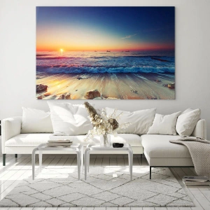 Quadro em vidro - Pôr do sol sobre a praia com ondas suaves e mar calmo - 70x50cm - E além do horizonte? - Decoração de parede moderna para a sala de estar e quarto ARTTOR