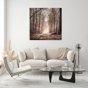 Quadro em vidro - Estrada florestal na neblina da manhã - 70x50cm - Catedral na Floresta - Decoração de parede moderna para a sala de estar e quarto ARTTOR