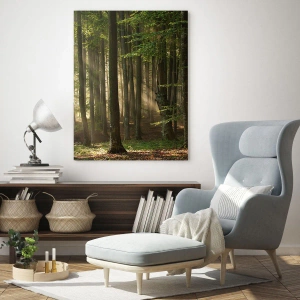 - pintura retrata uma floresta pitoresca com a luz do sol filtrada pelas árvores. A harmonia da natureza e a luz sutil criam uma decoração de parede única, perfeita para interiores com estilo natural.
