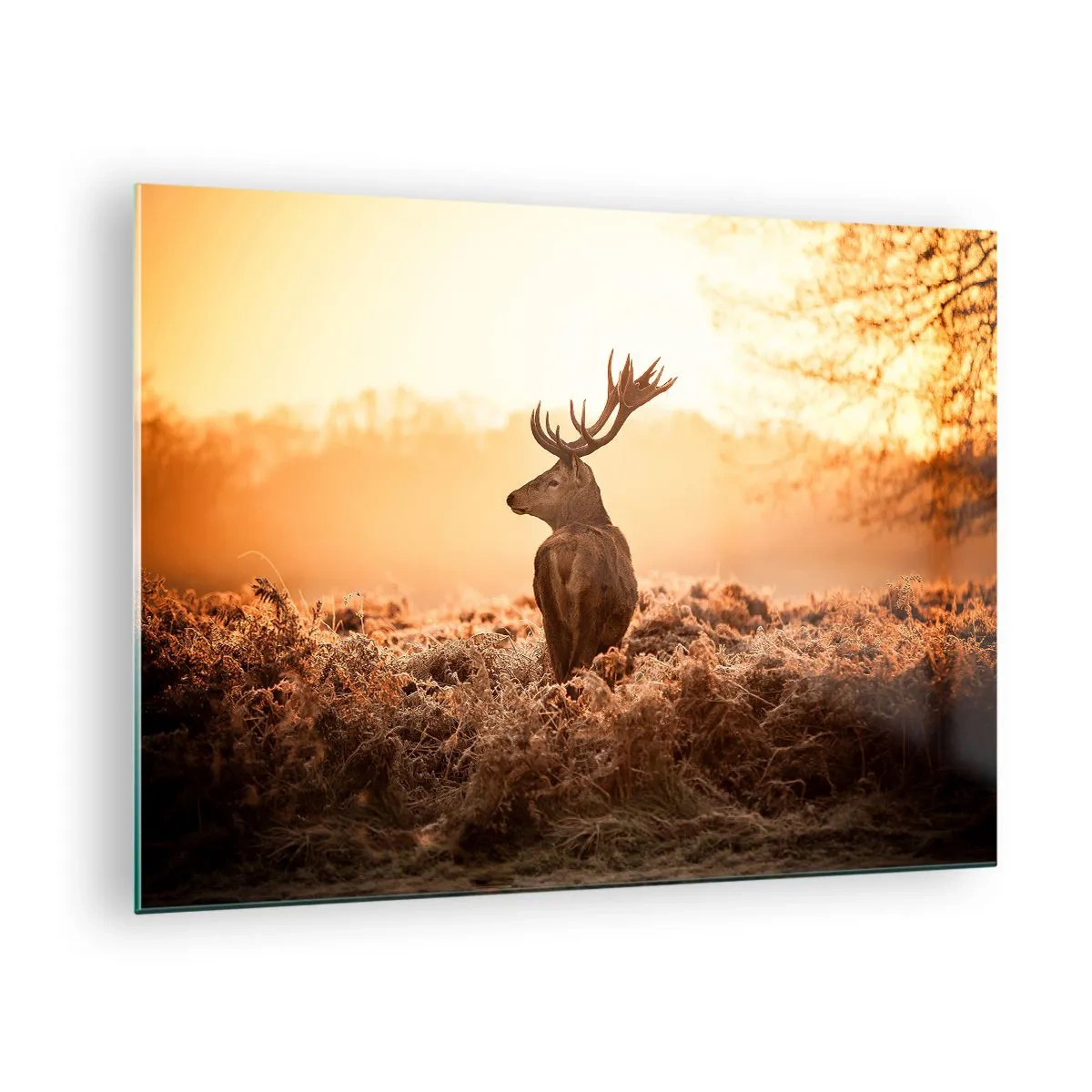 Quadro em vidro - Veado tendo como pano de fundo o nascer do sol em uma paisagem natural - 70x50cm - O senhor da propriedade - Decoração de parede moderna para a sala de estar e quarto ARTTOR
