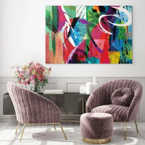 Abstração colorida com formas e texturas dinâmicas é uma decoração que atrai a atenção e traz energia a qualquer interior. Esta pintura em vidro de 70x50 cm distingue-se pela sua durabilidade e elegância.