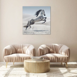 Um cavalo branco saltando contra as dunas do deserto é uma decoração que traz a elegância e a energia da natureza para o seu interior. A pintura em vidro de 70x50 cm se destaca por sua durabilidade e expressividade.