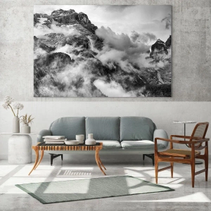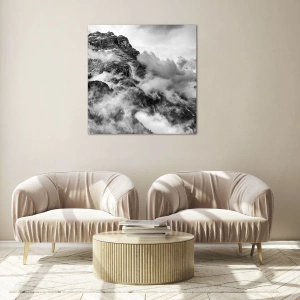 A impressão em vidro garante alta qualidade, durabilidade da cor e precisão nos detalhes. Os tons de preto e branco permitem uma combinação sutil com diversos designs de interiores, conferindo-lhes um caráter moderno e uma expressão elegante. A neblina pairando sobre os vales das montanhas enfatiza o mistério e a tranquilidade que a pintura traz ao espaço.