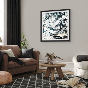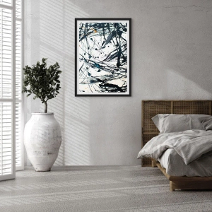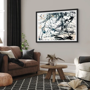 • Este pôster apresenta linhas abstratas e expressivas sobre um fundo branco. A composição dinâmica, emoldurada por uma moldura preta, é uma decoração moderna ideal para interiores minimalistas e artísticos.