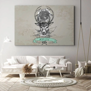 Quadro em tela - Geometria de veado em estilo vintage com letras Wild Life - 70x50cm - A Visão de Santo Hubertus - Decoração de parede moderna para a sala de estar e quarto ARTTOR