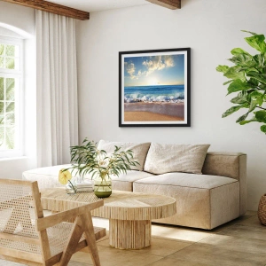 - Este pôster retrata uma praia com ondas quebrando na costa e um horizonte ensolarado. Perfeito para interiores náuticos e relaxantes. O produto vem com uma moldura preta de 50x70 cm.