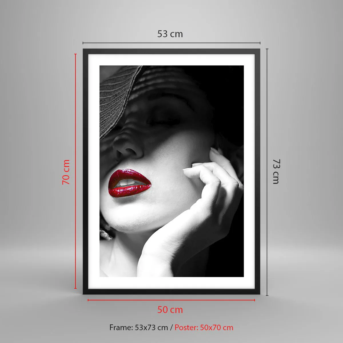 Pôster com moldura preta - Retrato de uma mulher de chapéu com lábios vermelhos - 50x70cm - Um estudo em vermelho - Decoração de parede moderna para a sala de estar e quarto ARTTOR
