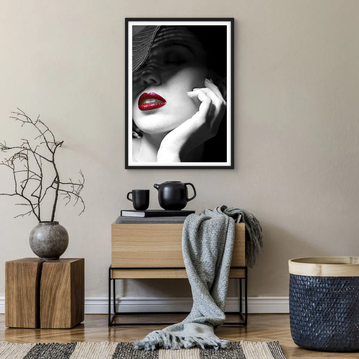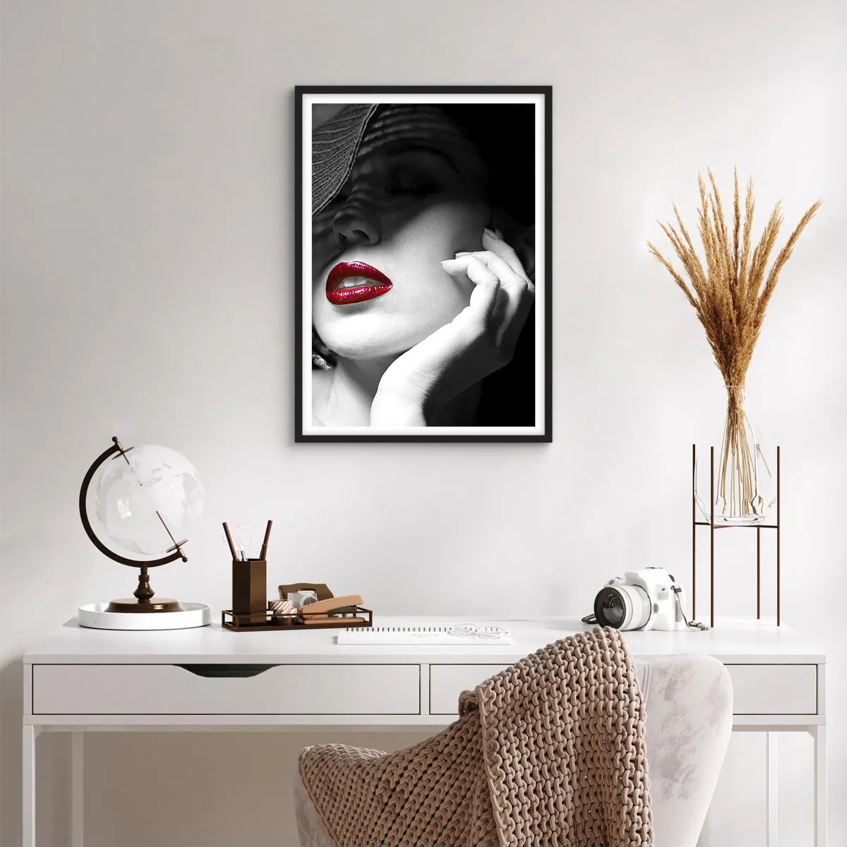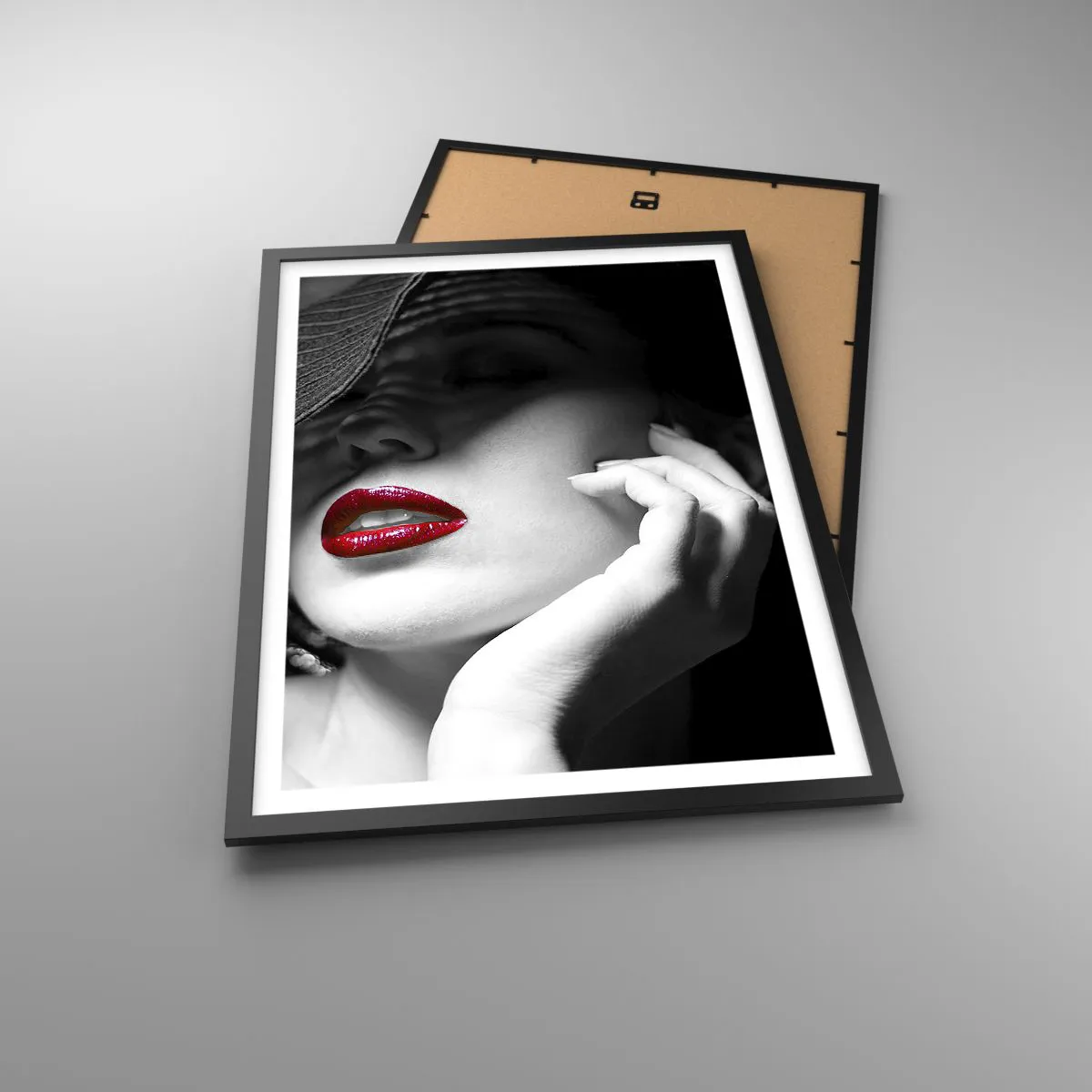 - Este pôster glamoroso retrata uma mulher usando um chapéu e realçando os lábios vermelhos. É um complemento perfeito para interiores elegantes, minimalistas ou artísticos.