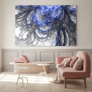 - Esta impressão em vidro de 70x50 cm apresenta uma abstração dinâmica em tons de azul e cinza. Perfeita para interiores modernos com personalidade única.
