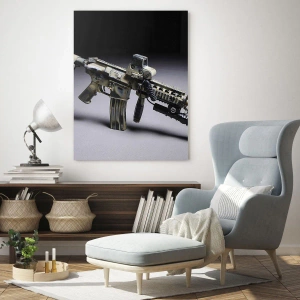 Esta arte em vidro representando um rifle moderno é perfeita para quem busca decorações exclusivas em estilo industrial. Sua composição expressiva e detalhes precisos conferem à imagem um caráter dinâmico e poderoso. Perfeito para amantes de objetos militares e elementos decorativos colecionáveis.