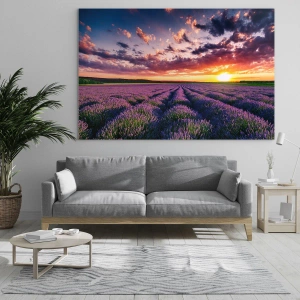 - Um pitoresco campo de lavanda ao pôr do sol, com um céu colorido e raios dourados. Uma paisagem encantadora, perfeita para interiores em estilo provençal, trazendo a paz e a harmonia da natureza.