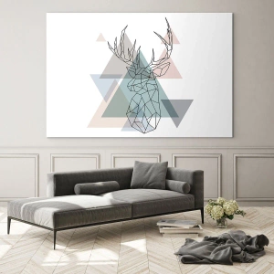 Quadro em vidro - Desenho geométrico de um cervo sobre um fundo de triângulos em tons pastéis - 70x50cm - Numa floresta geométrica - Decoração de parede moderna para a sala de estar e quarto ARTTOR