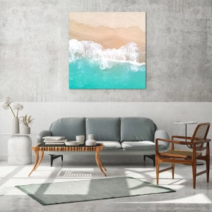 Quadro em vidro - Vista aérea da praia com águas turquesas e ondas brancas - 70x50cm - Toque carinhoso - Decoração de parede moderna para a sala de estar e quarto ARTTOR