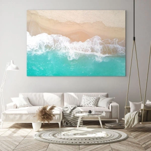 - Esta pintura em vidro retrata uma vista aérea de uma praia com águas azul-turquesa e ondas brancas. Perfeita para interiores que valorizam a paz, a harmonia e os temas naturais.