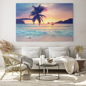 Quadro em vidro - Praia das palmeiras ao pôr do sol com um barco no horizonte - 70x50cm - Noite na baía - Decoração de parede moderna para a sala de estar e quarto ARTTOR