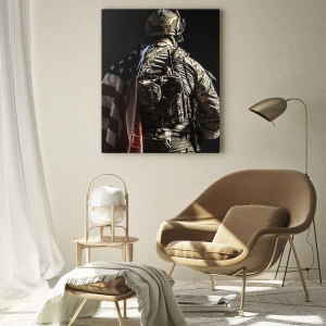Quadro em vidro - Um soldado com uma bandeira americana contra um fundo escuro - 70x50cm - É por isso - Decoração de parede moderna para a sala de estar e quarto ARTTOR