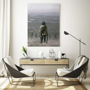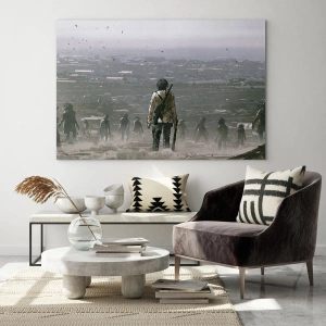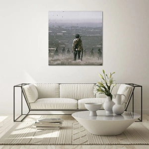 Quadro em vidro - Uma figura com um rifle no cenário escuro de um grupo que se aproxima - 70x50cm - O último justo? - Decoração de parede moderna para a sala de estar e quarto ARTTOR
