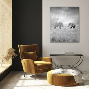 - Dois elefantes majestosos na savana em tons de preto e branco. Um sutil motivo da natureza que traz harmonia e elegância ao interior.