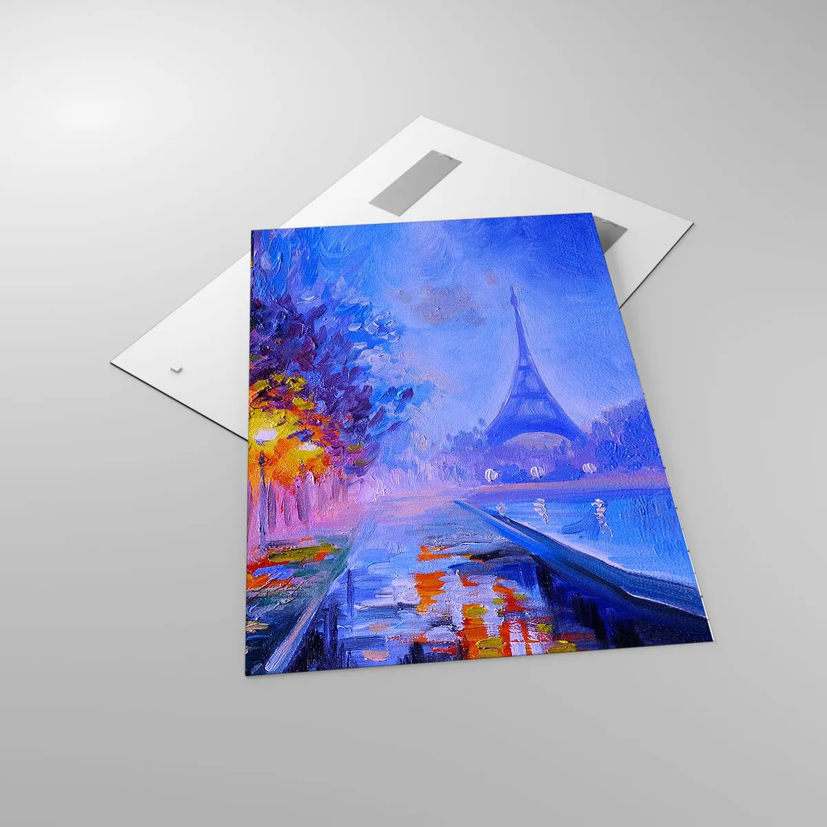O quadro em vidro é feito de vidro de 4mm de espessura. As bordas do vidro têm um corte trapezoidal fosco. O quadro é segura de usar e pronto para pendurar – tem ganchos de metal presos à parte de trás do quadro e e espaçadores de espuma para regular a distância uniforme do quadro da parede.