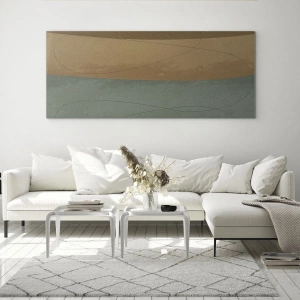 A pintura é feita em vidro medindo 70x50 cm, o que lhe confere um caráter elegante e moderno. Graças à sua paleta de cores suaves e linhas delicadas, a pintura funcionará perfeitamente em espaços de estilo escandinavo, industrial ou boho. Pode servir como decoração em uma sala de estar, quarto ou escritório, adicionando paz e classe ao interior.