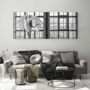 Quadro em vidro - Bailarina com asas de anjo em preto e branco - 70x50cm - Cidade dos Anjos? - Decoração de parede moderna para a sala de estar e quarto ARTTOR