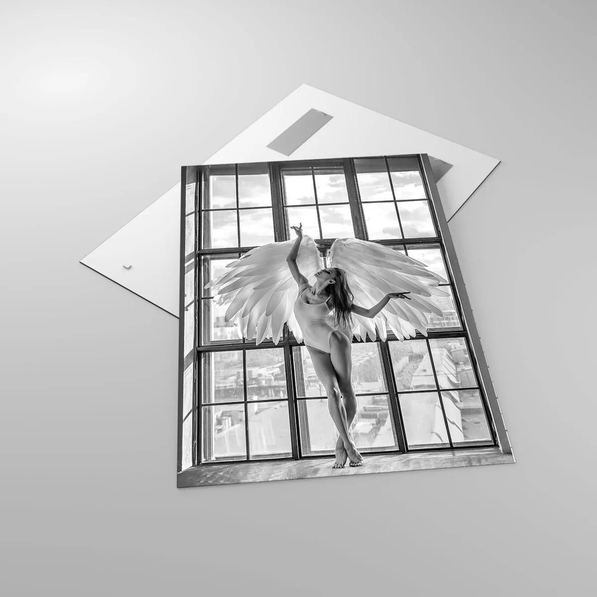 O quadro em vidro é feito de vidro de 4mm de espessura. As bordas do vidro têm um corte trapezoidal fosco. O quadro é segura de usar e pronto para pendurar – tem ganchos de metal presos à parte de trás do quadro e e espaçadores de espuma para regular a distância uniforme do quadro da parede.