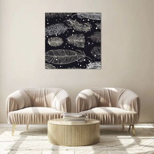 - Com delicadas penas brancas sobre um fundo preto, este design minimalista e elegante é perfeito para interiores modernos com um caráter sutil e refinado.