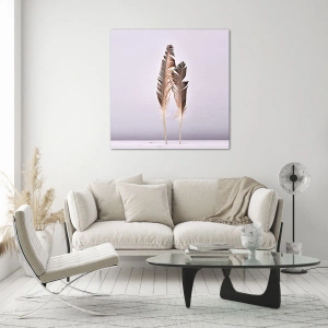 Quadro em vidro - Duas penas delicadas em um fundo claro - 70x50cm - Contra o nada - Decoração de parede moderna para a sala de estar e quarto ARTTOR