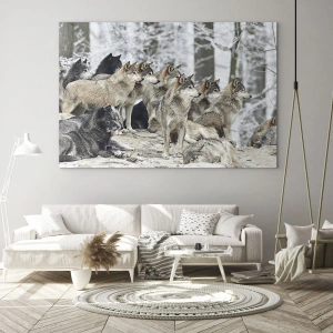 O quadro captura lobos em seu habitat natural - cercados por neve e árvores, simbolizando família, amizade e cooperação. Detalhes como o contraste entre a neve branca e os vários tons da pelagem dos lobos tornam o conjunto incrivelmente realista e elegante.