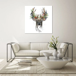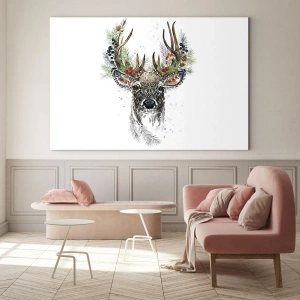 Quadro em vidro - Retrato de um cervo com decorações de Natal, galhos e frutas vermelhas - 70x50cm - Num manto festivo - Decoração de parede moderna para a sala de estar e quarto ARTTOR