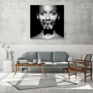 - Um retrato em preto e branco de uma mulher com uma borboleta cobrindo a boca. A imagem exala mistério, elegância e sensualidade, criando uma poderosa mensagem simbólica em um formato minimalista e moderno. Uma decoração de interiores ideal.