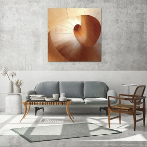 Pinturas em vidro estão se tornando uma solução popular em design de interiores, tanto privados quanto comerciais. O motivo espiral e o uso da madeira fazem com que a pintura "Serpente Arquitetônica" se alinhe perfeitamente às tendências de design contemporâneo. É uma decoração que introduz ritmo, profundidade e harmonia a um espaço – uma abordagem única à arquitetura em uma forma esteticamente elegante. Harmoniza-se perfeitamente com interiores voltados para o design, onde cada elemento importa e cria uma composição bem pensada. Esta pintura pode se tornar o ponto focal de uma sala de estar, um complemento elegante para uma área de recepção ou um elemento esteticamente dominante em um espaço público. É uma obra que combina arte, artesanato e tecnologia moderna em um todo coeso.