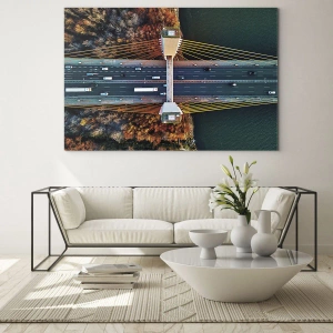 - Vista aérea de uma ponte estaiada moderna com tráfego e simetria geométrica. Esta impressão em vidro da ARTTOR mede 70x50 cm no formato horizontal. Perfeita para interiores modernos.