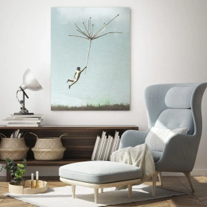- Uma cena artística retratando um menino flutuando com uma semente de dente-de-leão. Uma pintura repleta de leveza e imaginação infantil, em cores delicadas, perfeita para interiores com um toque de fantasia e sonho.