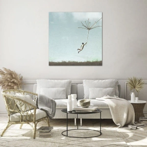Quadro em vidro - Um menino voando com uma semente de dente-de-leão sobre um prado - 70x50cm - Papagaios, balões, vento - Decoração de parede moderna para a sala de estar e quarto ARTTOR