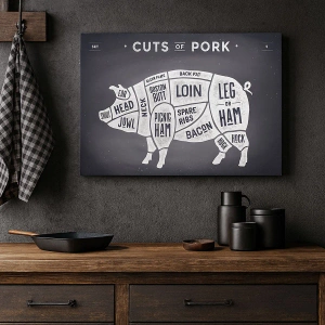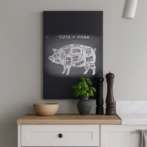 • Gastronomia, Animal Porco, Porco, Preto e branco, Gastronomia, Animais, Para a sala de jantar, Para a cozinha Branco, preto, preto e branco, Vertical