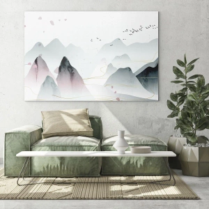 - Uma composição minimalista de montanhas em tons pastéis com um bando de pássaros voando e linhas douradas. Esta pintura evoca paz, harmonia e delicadeza. Perfeita para interiores em estilo moderno, japonês ou escandinavo.