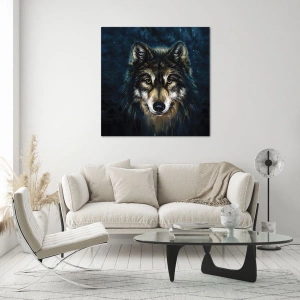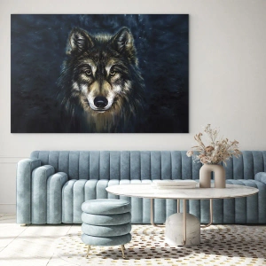 Quadro em vidro - Um lobo contra um fundo escuro de floresta em um estilo realista. - 70x50cm - Alfa? E ómega - Decoração de parede moderna para a sala de estar e quarto ARTTOR