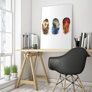 O quadro em vidro é feito de vidro de 4mm de espessura. As bordas do vidro têm um corte trapezoidal fosco. O quadro é segura de usar e pronto para pendurar – tem ganchos de metal presos à parte de trás do quadro e e espaçadores de espuma para regular a distância uniforme do quadro da parede.