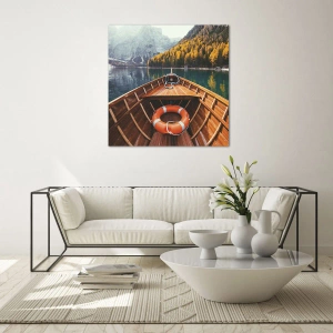 Quadro em vidro - Vista de um barco de madeira de um lago de montanha e uma floresta de outono - 70x50cm - Excursão na montanha - Decoração de parede moderna para a sala de estar e quarto ARTTOR