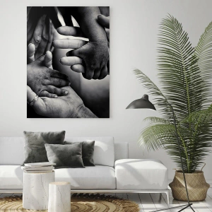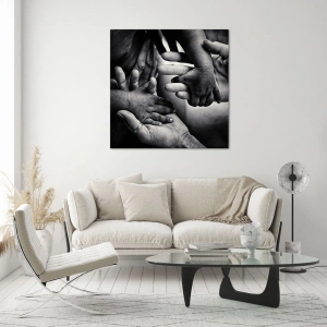 • Uma representação simbólica em preto e branco das mãos de pessoas de várias idades, capturando emoções, laços e humanidade. Uma composição artística sutil que complementa perfeitamente espaços propícios à reflexão e experiências profundas.