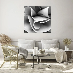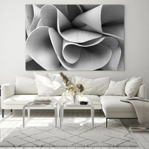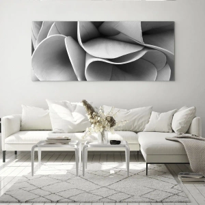 • Uma composição artística em preto e branco com formas espirais e em forma de pétalas. Este detalhe abstrato em um ambiente minimalista é ideal para interiores modernos e espaçosos em estilo loft ou industrial.