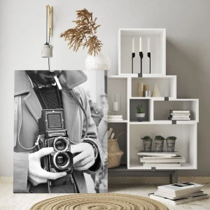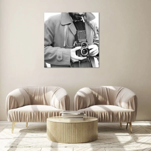 Quadro em vidro - Foto em preto e branco de um homem com uma câmera analógica - 70x50cm - Estilo retro - Decoração de parede moderna para a sala de estar e quarto ARTTOR