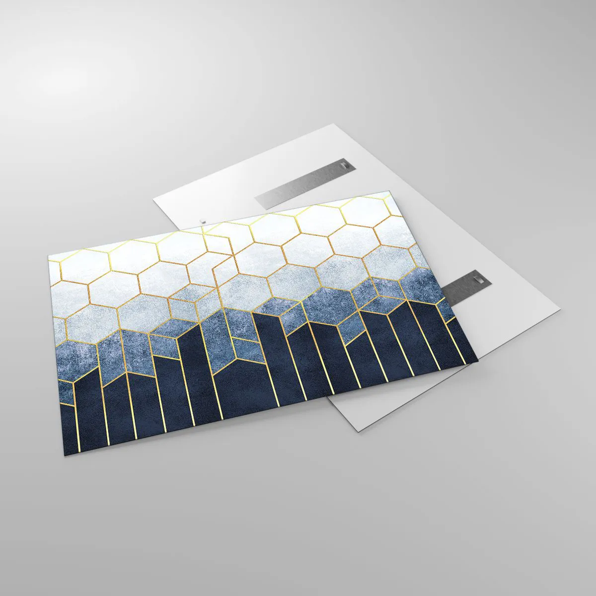 O quadro em vidro é feito de vidro de 4mm de espessura. As bordas do vidro têm um corte trapezoidal fosco. O quadro é segura de usar e pronto para pendurar – tem ganchos de metal presos à parte de trás do quadro e e espaçadores de espuma para regular a distância uniforme do quadro da parede.
