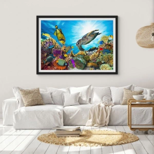 - Este pôster retrata a vida marinha colorida, com peixes tropicais, uma tartaruga e um belo recife de coral. É perfeito para entusiastas da natureza e do subaquático. Vem com moldura preta e mede 50x70 cm.
