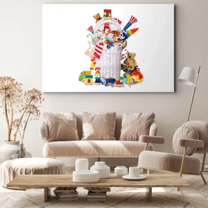 - Esta tela de 70x50 cm retrata uma cesta colorida cheia de brinquedos infantis. Perfeita para decorar o quarto de uma criança e criar interiores alegres.