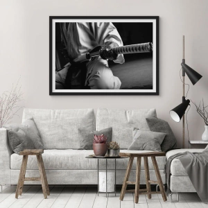 - Uma elegante fotografia em preto e branco de um samurai com uma espada. Um pôster perfeito para interiores minimalistas, como salas de estar, escritórios ou quartos.