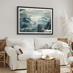 Pôster com moldura preta - Um navio em um mar tempestuoso perto de um castelo no nevoeiro - 50x70cm - Nas águas mágicas - Decoração de parede moderna para a sala de estar e quarto ARTTOR