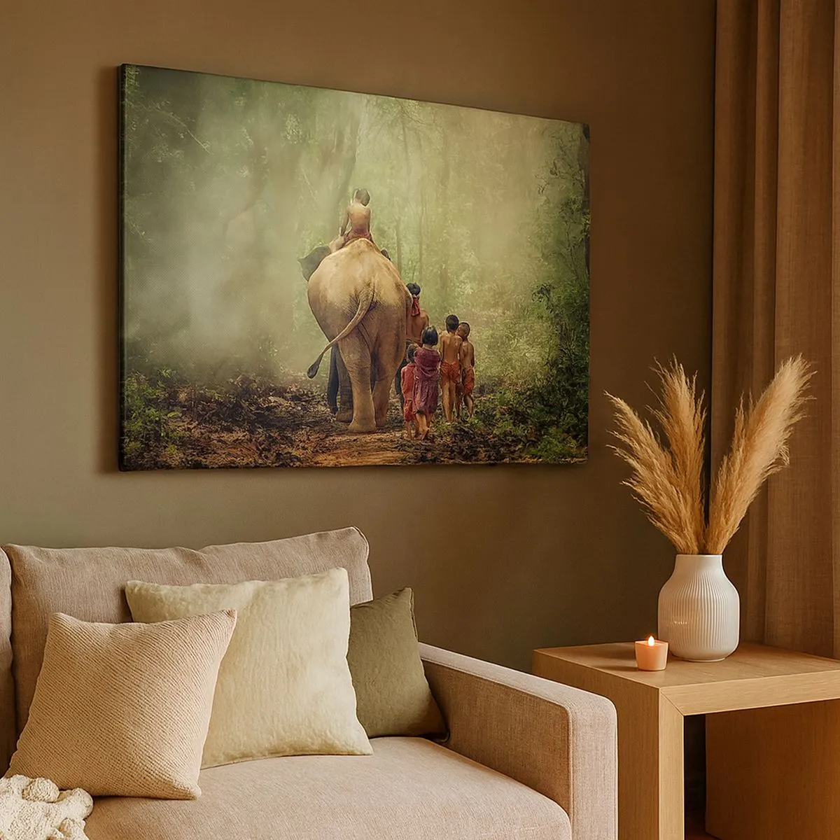 - Uma pintura que retrata crianças conduzindo um elefante por uma densa floresta ao amanhecer. Uma cena harmoniosa que transmite paz e proximidade com a natureza, perfeita para interiores exóticos e elegantes.