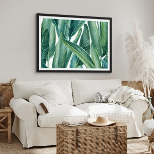 - Um pôster com um motivo de folhas de bananeira verdes em estilo aquarela, perfeito para interiores modernos, com moldura preta incluída.